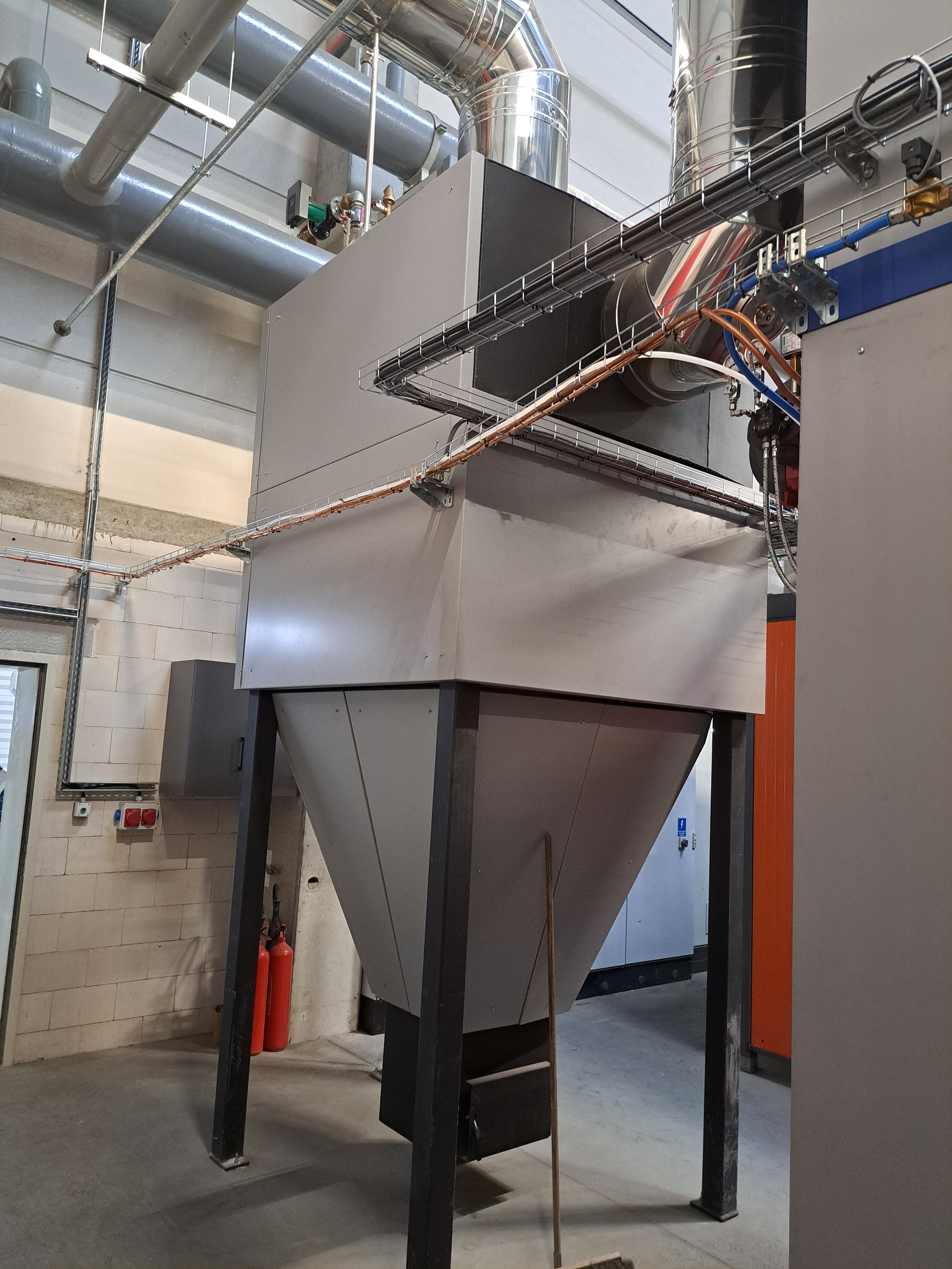 Poza sercem instalacji - blokiem kotła i osadzonym na nim wymiennikiem ciepła, w kotłowni znajdują się dwa urządzenia, gwarantujące maksymalną redukcję emisji cząstek stałych do atmosfery. Pierwszym stopniem filtracji jest multicyklon, wykorzystujący siłę odśrodkową i grawitacji w procesie odpylania spalin. Multicyklon ma zdolność do separacji cząstek stałych o największej masie i dużych wymiarach, jednakże nie jest skuteczny w odniesieniu do najdrobniejszych, a zarazem najbardziej szkodliwych cząstek. Dlatego też instalacja termicznego przekształcania odpadów wyposażona jest w filtr elektrostatyczny, produkcji Elenergy. Elektrofiltry gwarantują najwyższą efektywność odpylania spalin - ze względu na szereg zjawisk elektrostatycznych, zachodzących wewnątrz komory odpylacza, mają one zdolność do separacji nawet najmniejszych cząstek stałych. Ich dodatkowymi atutami są niskie opory hydrauliczne, szeroki zakres temperatur, w których mogą pracować oraz niskie koszty eksploatacyjne.
